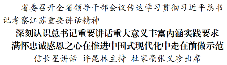 信長(zhǎng)星在講話中說(shuō),江蘇一直是習(xí)近平總書記的關(guān)注點(diǎn)、調(diào)研點(diǎn)和研究點(diǎn),總書記對(duì)江蘇的關(guān)注始終是進(jìn)行時(shí)。黨的十八大以來(lái),習(xí)近平總書記多次親臨江蘇考察指導(dǎo),發(fā)表一系列重要講話、作出一系列重要指示,為江蘇發(fā)展精準(zhǔn)把脈、擘畫藍(lán)圖。當(dāng)前,中華民族偉大復(fù)興正在育新機(jī)、開新局,全面建設(shè)社會(huì)主義現(xiàn)代化國(guó)家處在開局起步的關(guān)鍵階段。習(xí)近平總書記再次深入江蘇考察,時(shí)隔4個(gè)月對(duì)江蘇工作作出新的重要指示,飽含著對(duì)江蘇人民的深情厚愛和巨大關(guān)懷,充分體現(xiàn)了對(duì)江蘇發(fā)展一以貫之的殷切期望和信任重托。這次考察,總書記著眼強(qiáng)國(guó)建設(shè)、民族復(fù)興,聚焦中國(guó)式現(xiàn)代化的重點(diǎn)領(lǐng)域提出一系列新思想新觀點(diǎn)新論斷,明確指出江蘇有能力也有責(zé)任在推進(jìn)中國(guó)式現(xiàn)代化中走在前、做示范,賦予我們?cè)诳萍紕?chuàng)新上取得新突破、在強(qiáng)鏈補(bǔ)鏈延鏈上展現(xiàn)新作為、在建設(shè)中華民族現(xiàn)代文明上探索新經(jīng)驗(yàn)、在推進(jìn)社會(huì)治理現(xiàn)代化上實(shí)現(xiàn)新提升的“四個(gè)新”重大任務(wù),并對(duì)“以學(xué)促干”作出深刻闡釋,給全省上下以極強(qiáng)的思想指引、精神鼓舞、奮斗感召,為新征程上江蘇應(yīng)該干什么、怎樣干得更好進(jìn)一步指明了前進(jìn)方向、提供了行動(dòng)指南、明確了目標(biāo)路徑。我們要滿懷忠誠(chéng)感恩之心,自覺從堅(jiān)定擁護(hù)“兩個(gè)確立”、堅(jiān)決做到“兩個(gè)維護(hù)”的高度,深入學(xué)習(xí)領(lǐng)會(huì)總書記重要講話精神,深刻把握蘊(yùn)含其中的重大政治意義、理論意義和實(shí)踐意義,胸懷“兩個(gè)大局”,牢記“國(guó)之大者”,把握“強(qiáng)省之要”,堅(jiān)定不移沿著總書記指引的方向勇毅前行,以當(dāng)表率、做示范、走在前的果敢擔(dān)當(dāng),奮力推進(jìn)中國(guó)式現(xiàn)代化江蘇新實(shí)踐,譜寫“強(qiáng)富美高”新江蘇現(xiàn)代化建設(shè)新篇章。